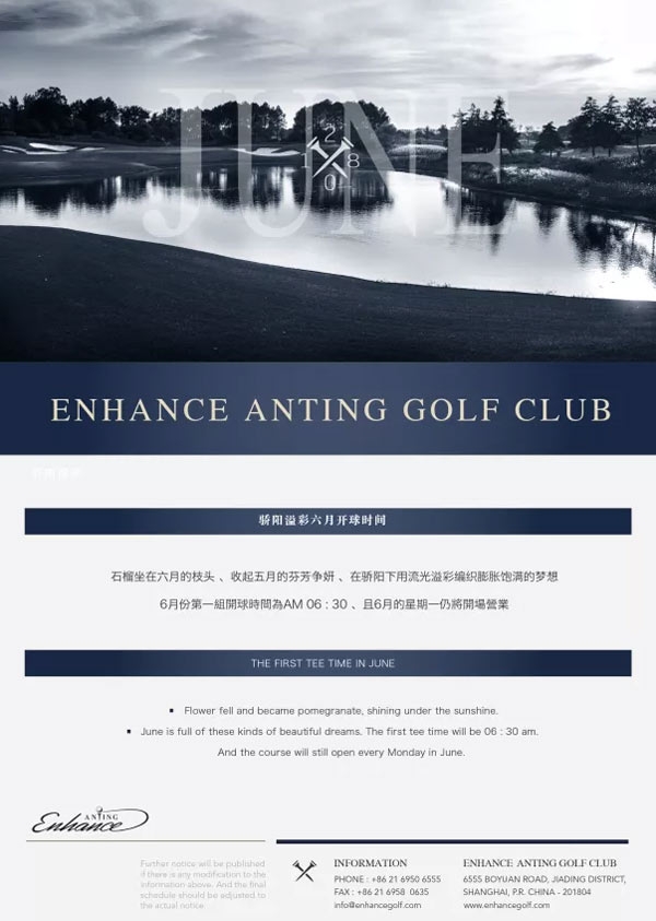 颖奕安亭高尔夫6月份第一组开球时间为06:30,且6月的星期一仍将开场营业。