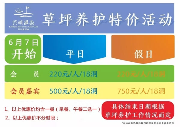 昆明温泉高尔夫球会将于6月7日(星期四)开始对18洞球场进行草坪打孔养护工作,养护期间的优惠价格如下: