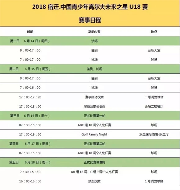6月15日至18日,宿迁.中国青少年高尔夫未来之星U18赛即将登陆宿迁。
