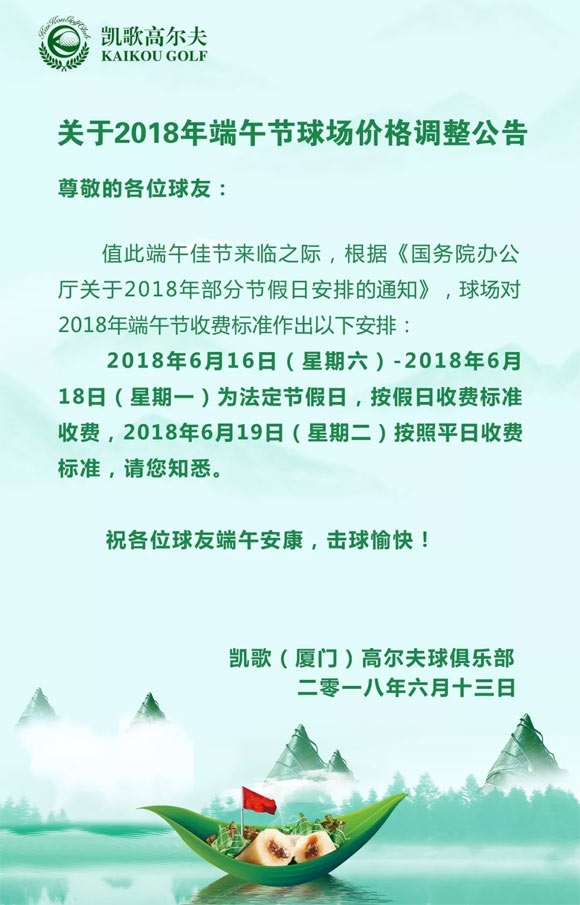 厦门凯歌高尔夫2018年端午节球场价格调整公告