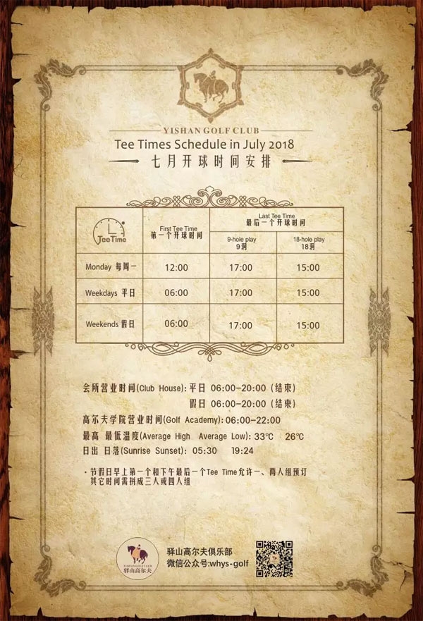 武汉驿山高尔夫俱乐部七月开球时间安排