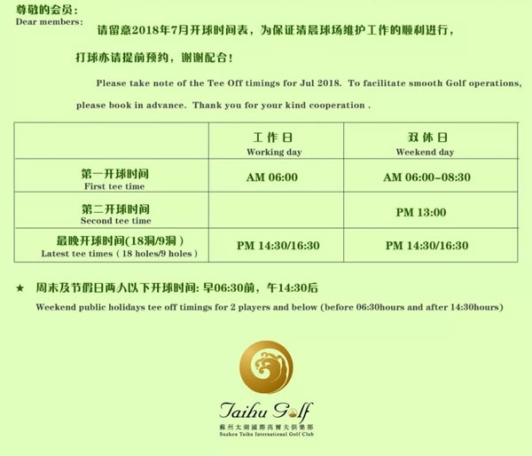 苏州太湖国际高尔夫俱乐部七月开球时间表