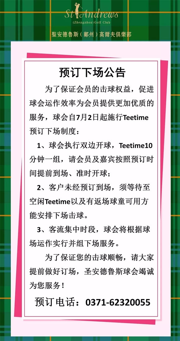 圣安德鲁斯(郑州)高尔夫球会预订下场公告