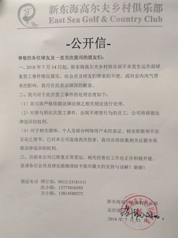 江苏太仓新东海高尔夫关于球童罢工事件的公开信