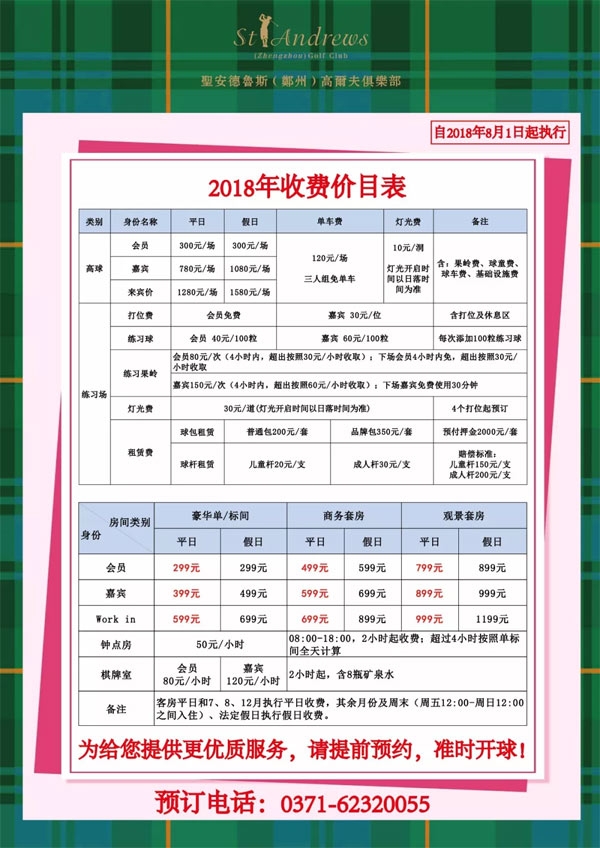 郑州圣安德鲁斯高尔夫球会营业价格调整公告