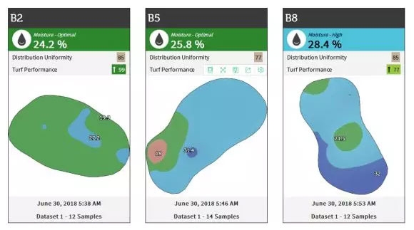 球会经营20多年来,因果岭造型改变、喷灌设备老化等原因,原有喷灌系统已不能满足果岭日常维护需求,经常造成果岭湿度不平衡(见下图)。