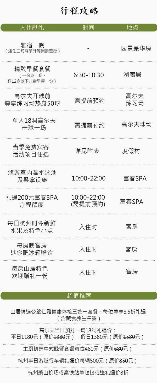 为爱好这项绅士运动的球友设计,富春山居推出高尔夫健康之旅,不仅有大床房和双床房可选,更有连住两晚可升等至园景套房礼遇;超值推荐选项中更是考虑到慕名而来的外籍和外地客人,杭州萧山机场或高铁接送享8折礼遇;而自驾游出游的客人亦可在山居大自然一天的运动后享受一份来自富春山居SPA的贴心照顾,礼遇200元富春SPA疗程额度,为您身体舒压,恢复能量。