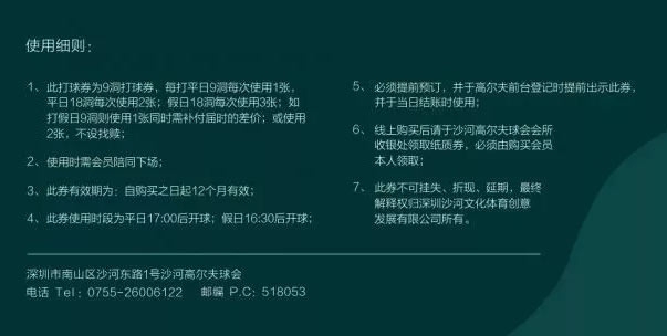6. 需提前预订,于高尔夫前台登记时提前出示此券,并于当日结账时使用;
