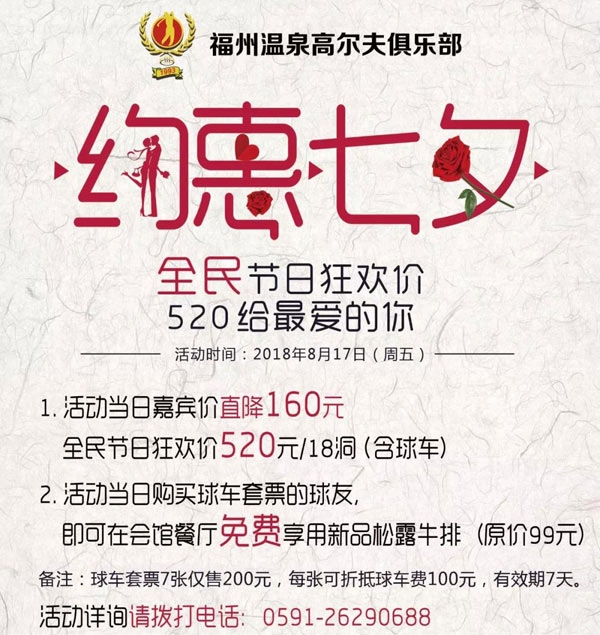 本次活动最终解释权归福州温泉高尔夫俱乐部所有,欢迎会员及广大球友踊跃邀伴到温泉高尔夫球场畅快挥杆,体验不一样的浪漫七夕。