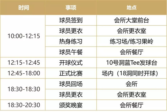 包含:礼品、果岭费、设施费、球童费、球车费、午餐及颁奖晚宴费用。