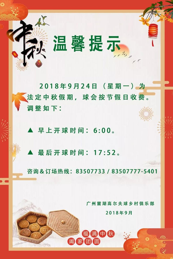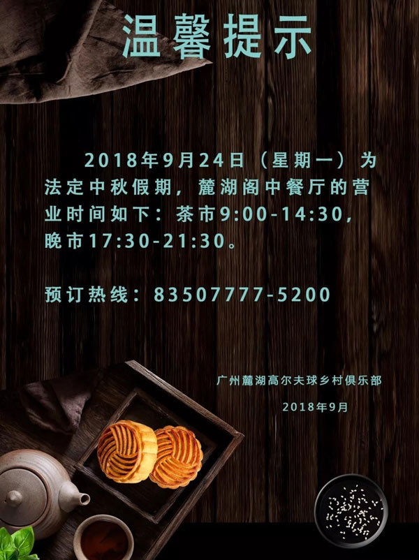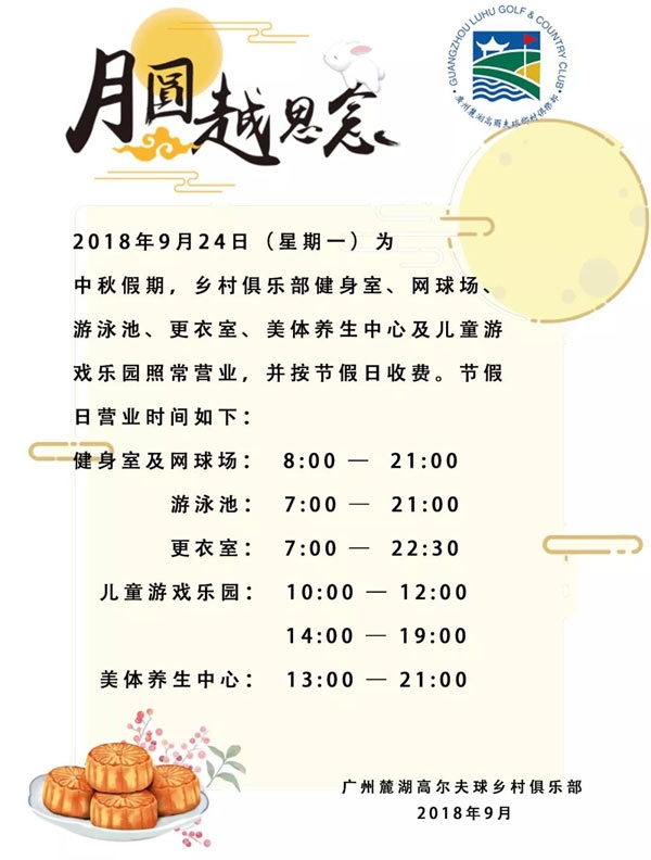 广州麓湖高尔夫球乡村俱乐部2018中秋佳节营业时间