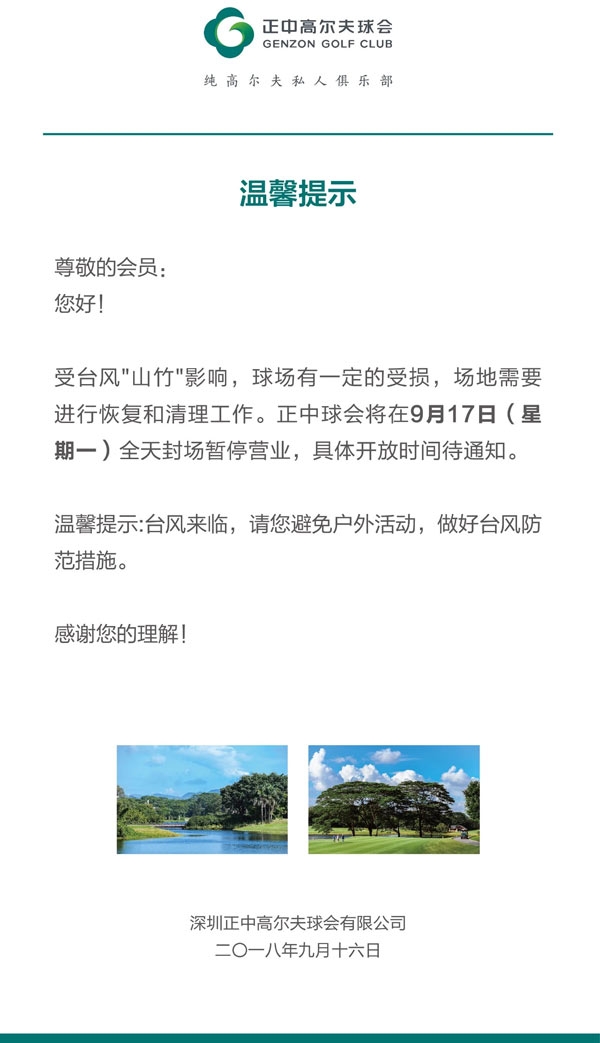 受台风“山竹”影响,深圳正中高尔夫球会封场公告
