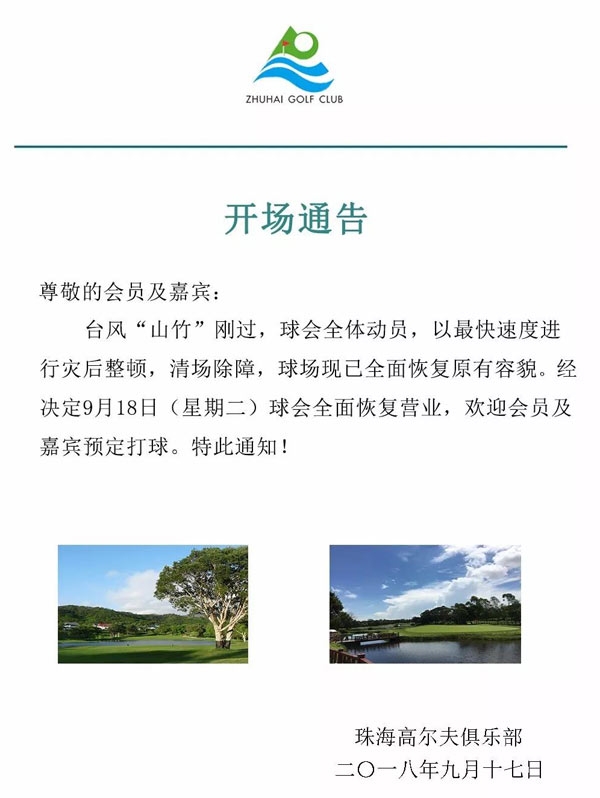 珠海国际高尔夫俱乐部9月18日开场通告