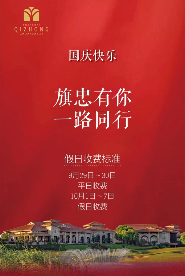 中秋阖家团圆的幸福还在回味中,转眼间马上又将迎来国庆黄金周。国庆节期间,恰逢秋高气爽,无论是举家出游,寄情山水,还是三五好友,畅享挥杆,都不失为一个好选择。在此,俱乐部预祝全体旗忠会员朋友节日快乐、幸福安康。节日期间,旗忠将对节假日收费标准做以下调整:
