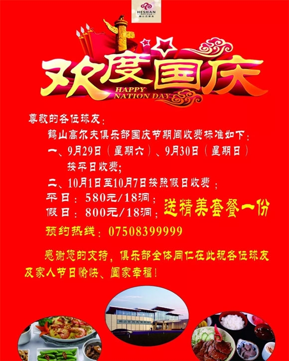 国庆假期即将到来,鹤山高尔夫俱乐部全体员工在此祝所有球友国庆快乐,全家幸福!国庆放假期间,收费如下: