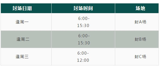 沙河高尔夫球会10月日常养护封场安排为:每周周一、周二、周三分别对A、B、C场进行封场养护,其中10月17日(周三)封C场养护延期至10月18日(周四),封场日期表如下: