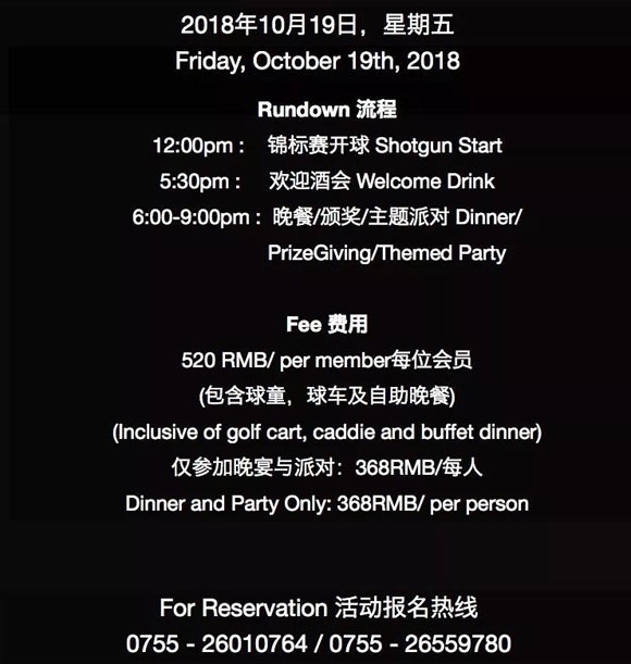 我们诚邀您参加2018年10月19日将在球会举办的第22届俱乐部锦标赛暨007黑白主题派对。