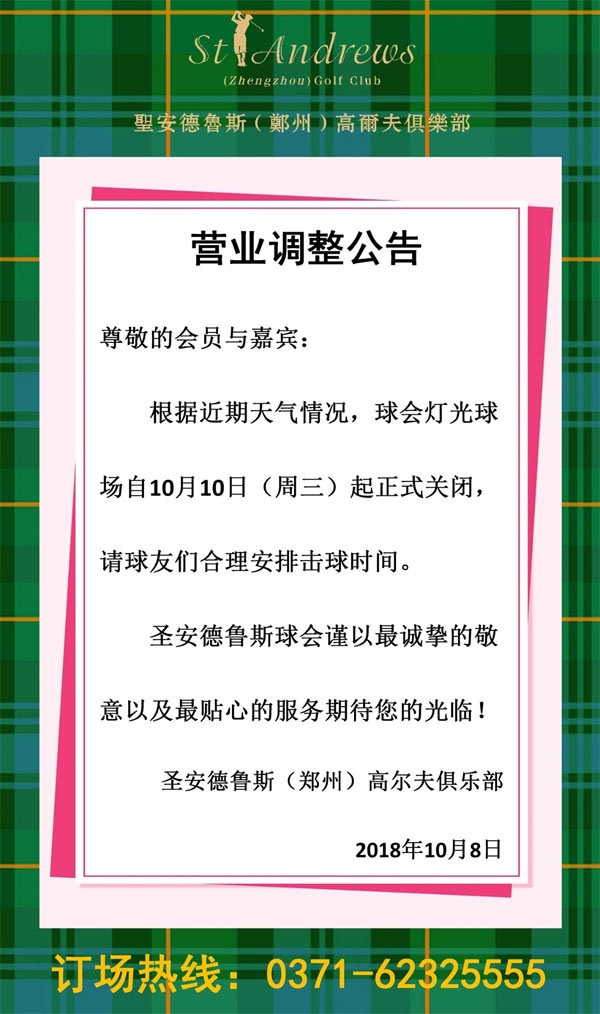 圣安德鲁斯郑州高尔夫俱乐部营业调整公告