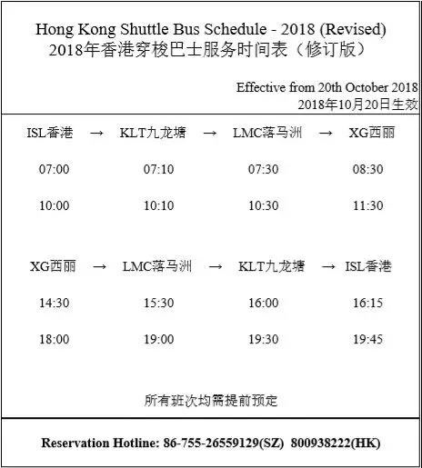 经过一段时间的维修保养,我们的三台香港穿梭巴士目前已经有一辆通过检修,将于本周六10月20日起,正常恢复运营,由于目前只有一辆车能够正常投入使用,因此服务时间上会有所调整,但穿梭路线保持不变,依然从港岛香格里拉酒店出发,经九龙塘、落马洲,到达球会。具体服务时间请见下表: