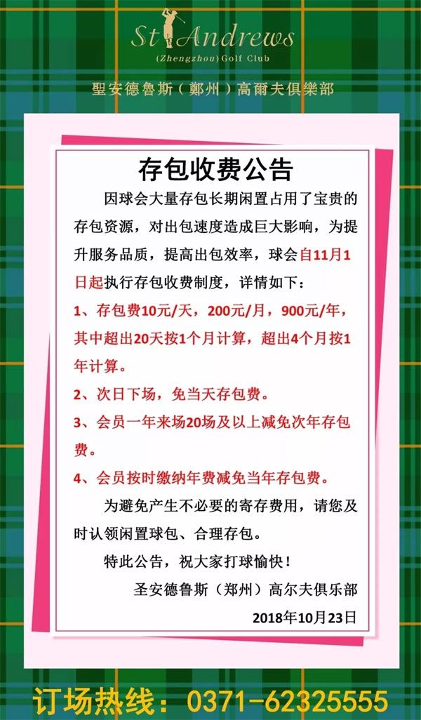 圣安德鲁斯(郑州)高尔夫关于存包收费的公告