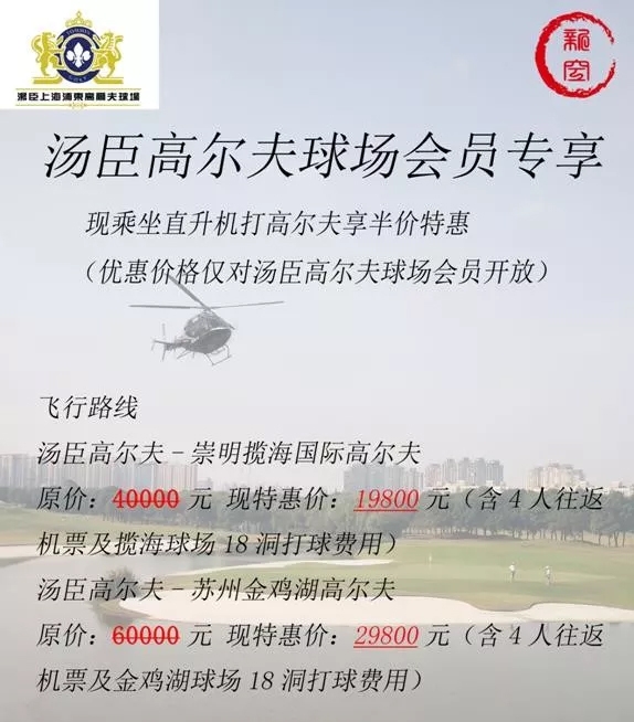 11月25日,汤臣高尔夫即将举办2018年度会员杯和排名赛,为答谢各位尊敬的会员,球会特别联合新空直升机公司,隆重推出“年度金秋钜惠”!