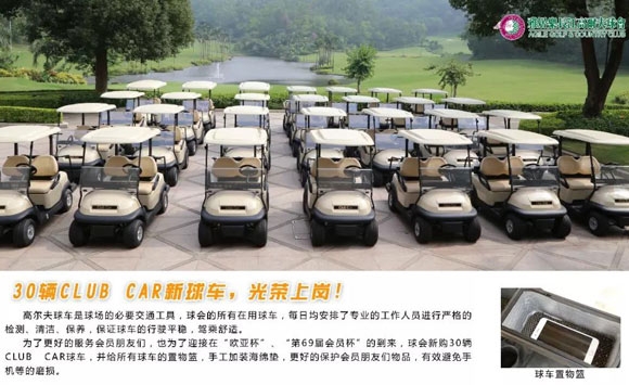 为了会员朋友们打球时更加尽兴,驾驶的球车更安全与方便,也为了迎接“欧亚杯”、“第69届会员杯”等赛事的到来,球会新购30辆CLUB CAR球车,并给所有球车的置物篮,手工加装海绵垫,更好的保护会员朋友们物品,有效避免手机等贵重物品的磨损。