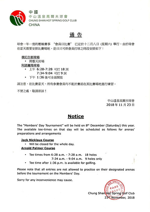 广东中山温泉高尔夫球会12月8日封场公告