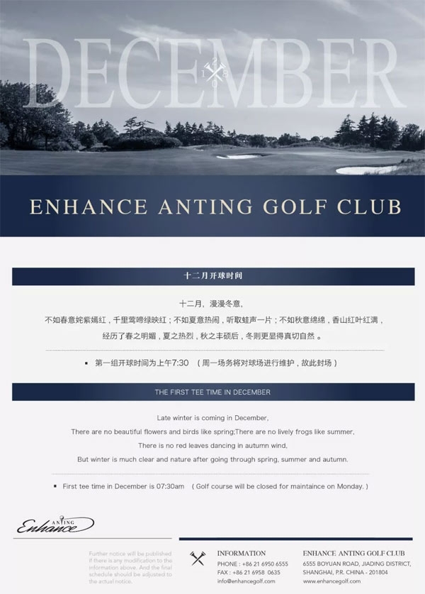上海颖奕安亭高尔夫十二月开球时间及封场通知