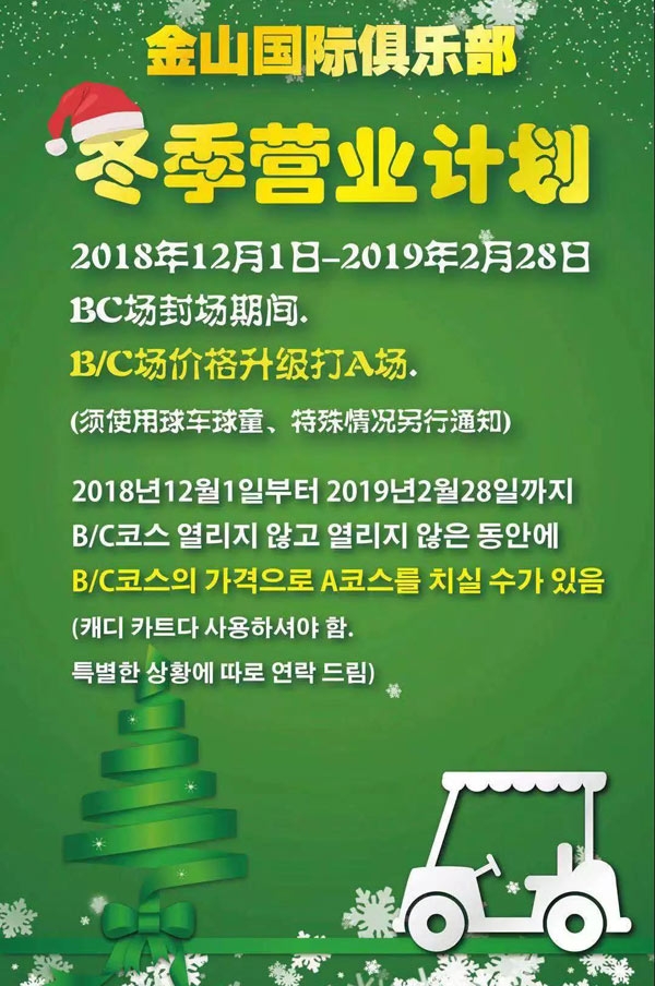 金山国际俱乐部于2018年12月1日起,截止至年底封场之前,每周一全员封场休息(节假日除外),给您带来的不便,请谅解!