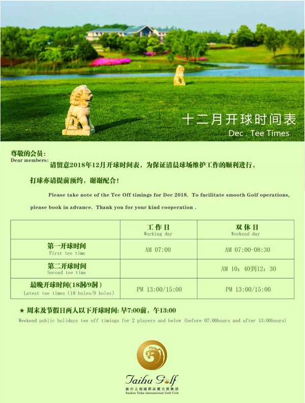 苏州太湖国际高尔夫俱乐部十二月开球时间表