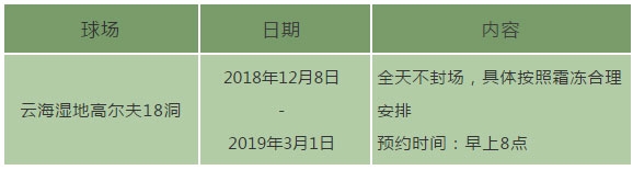 根据球场年度维护计划,球会将于2018年12月08日-2019年03月01日期间,按照实际天气情况、草坪霜冻情况,对球场18洞的果岭和练习果岭进行保护作业,届时球场最早开球时间调整为早上8点。