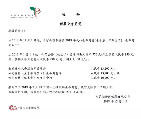 东莞海逸高尔夫球会预收2019年全年月费