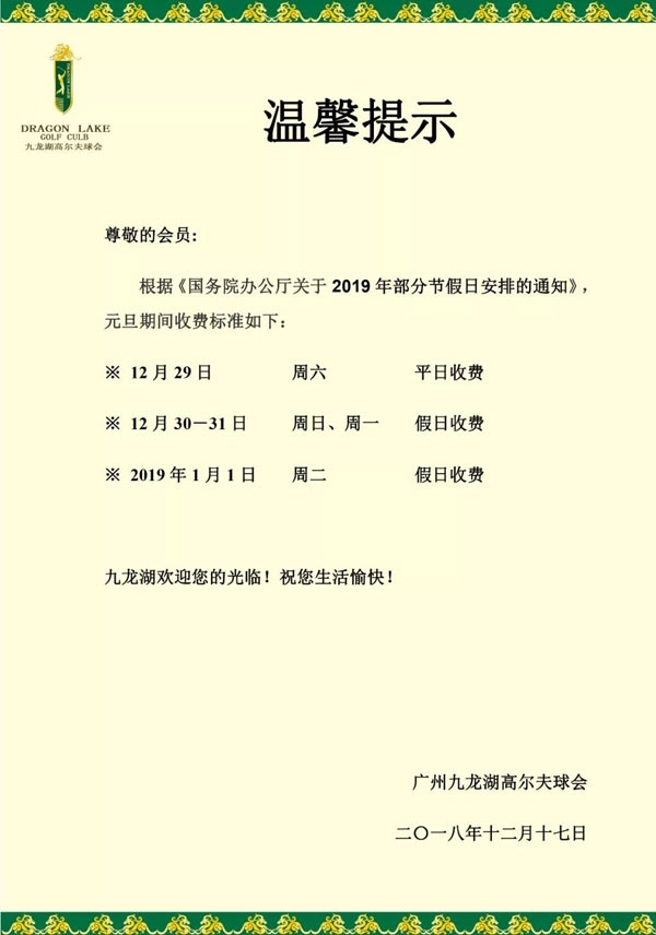 广州九龙湖高尔夫球会2019年元旦期间收费标准