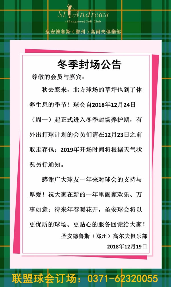 圣安德鲁斯郑州高尔夫球会2018年冬季封场公告