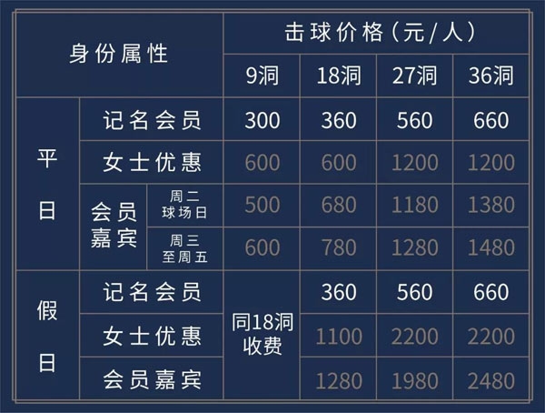 周末及法定假日单人配备一辆球车下场另加收50元/9洞单车费,陪走平日600元/18洞,假日1100元/18洞;