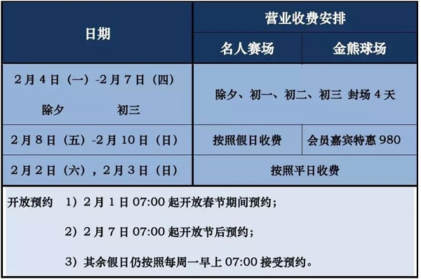 上海美兰湖高尔夫2019年1月、2月份营业安排