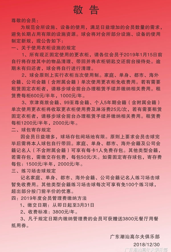 广东潮汕高尔夫俱乐部会所设备使用新规公告