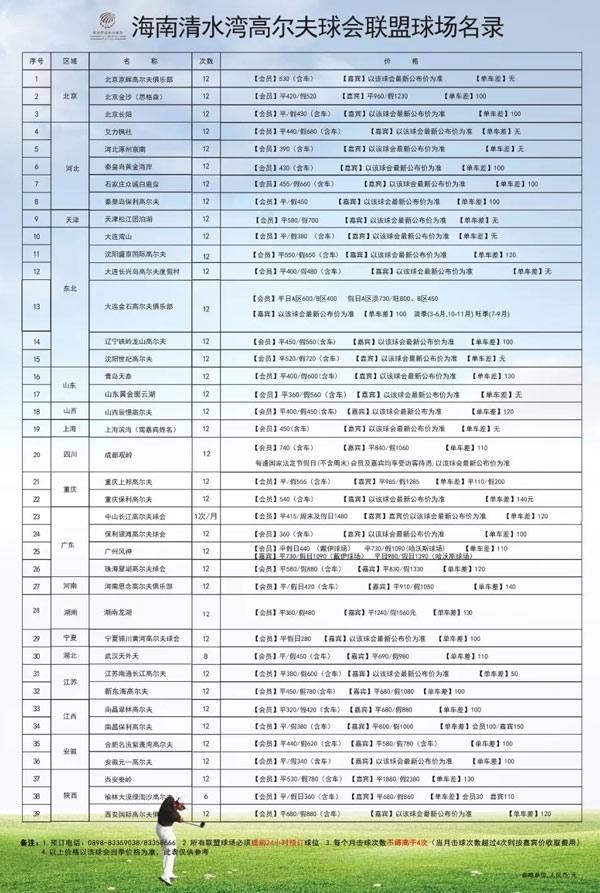 3.为维护联盟信誉及您的权益,如遇行程取消或迟到,请致电清水湾球会预订部以便做出相应的调整;
