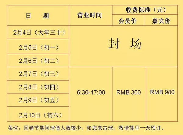 浙江横店禹山高尔夫春节营业安排