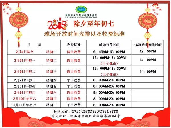 为了让各位宾客更好的安排春节假期时间,均安碧桂园球会将对2019年春节期间的营业时间作出适当调整,为确保您开球顺利,请提前预定打球时间,感谢您的理解与支持!