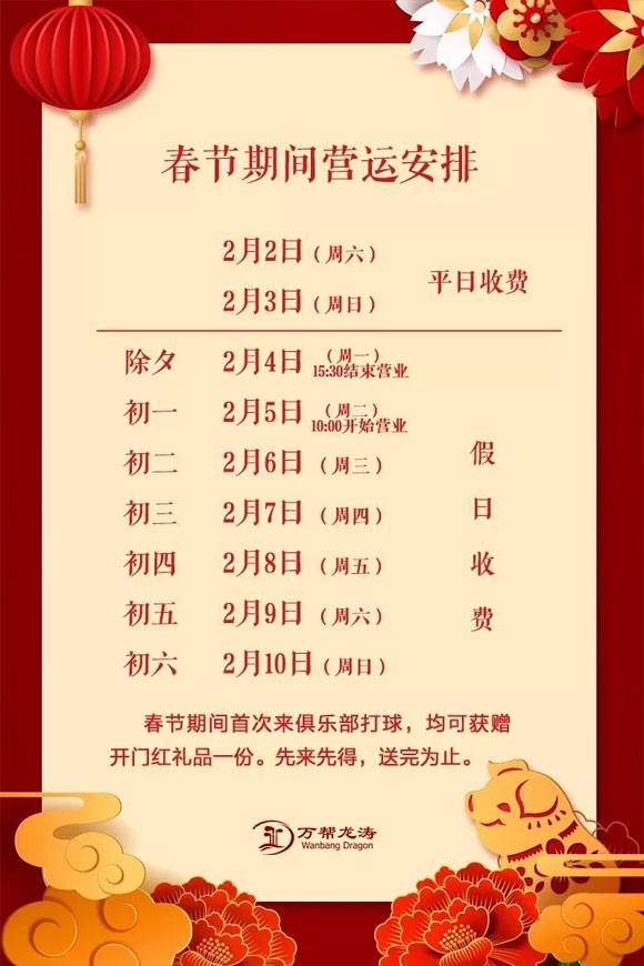 江阴万帮龙涛高尔夫春节假期营运安排