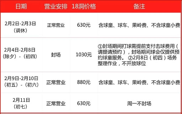 · 2月8日(初四)为场务整理场地作业,全天不开放球位,感谢您的理解与支持。