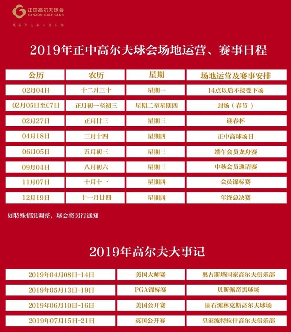 深圳正中高尔夫春节期间球场运营安排及2019年球会赛事安排