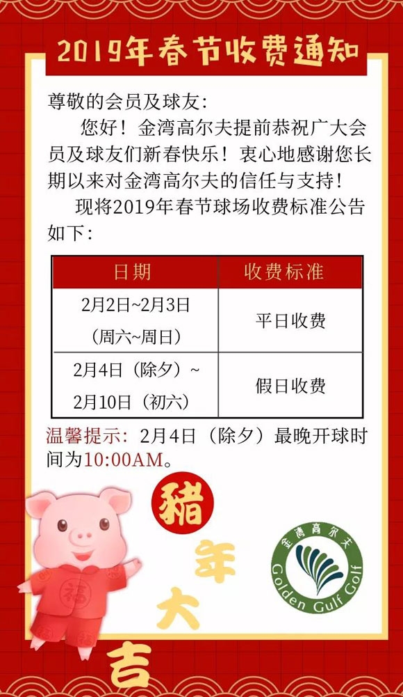 珠海金湾高尔夫2019年春节收费通知