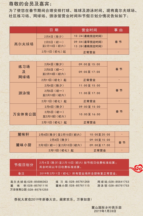 成都麓山国际高尔夫球会调整春节期间营业时间通知