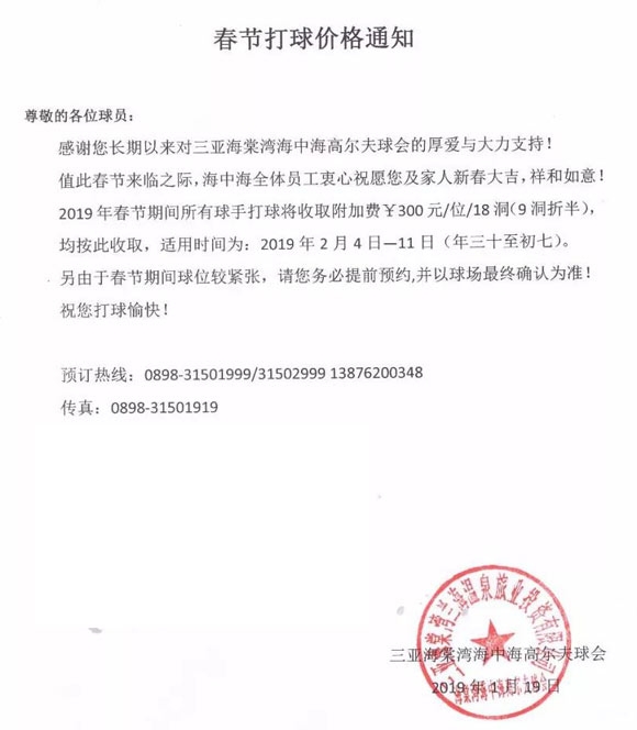 三亚海中海高尔夫球会2019年春节打球价格通知