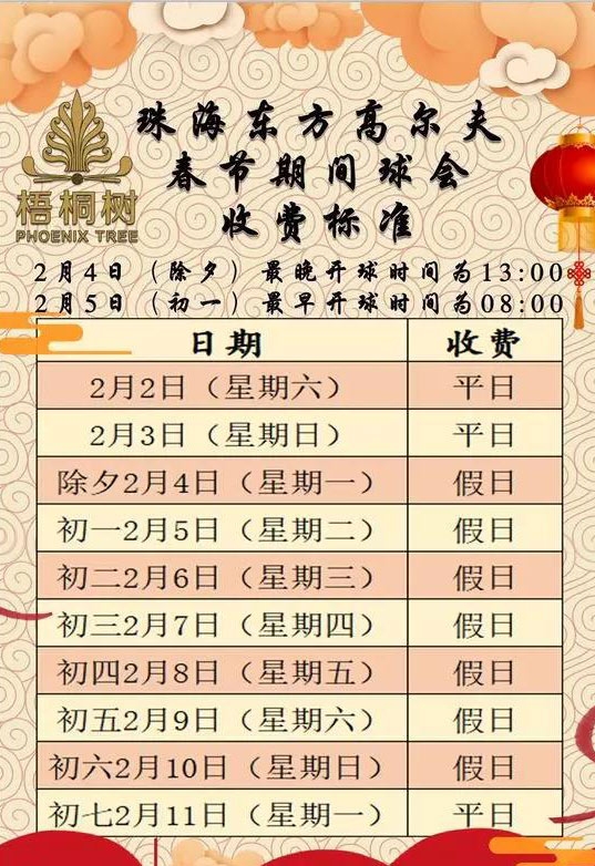 珠海梧桐树东方高尔夫2019年春节收费标准