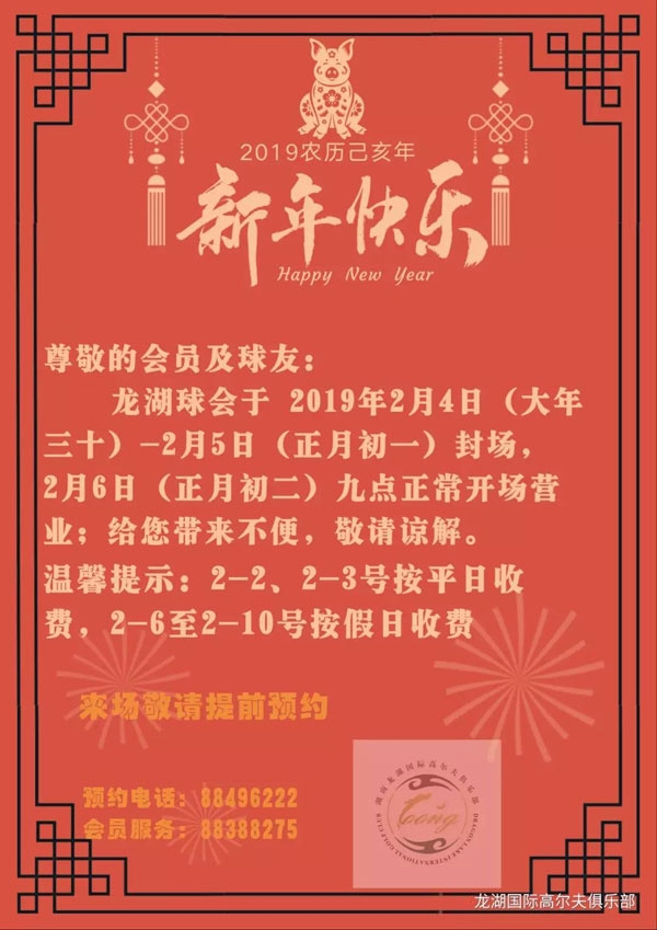龙湖球会2019年春节放假通知出来啦,除夕(2月4号)--大年初一(2月5号)球会封场,正月初二(2月6号)九点正式开始营业