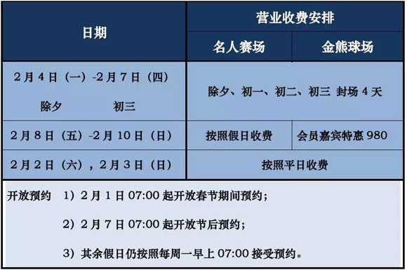 上海美兰湖高尔夫球会春节期间营业安排