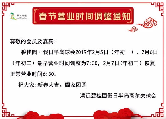 清远碧桂园假日半岛高尔夫球会春节营业时间调整